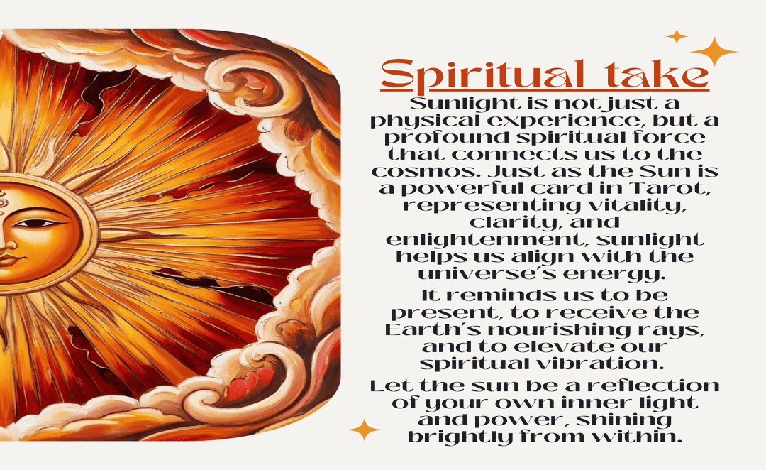 De spirituele kant: Zonlicht is veel meer dan alleen licht—het is een energie die ons verbindt met het universum. Het helpt ons om in het moment te zijn, onze energie op te laden en onze spirituele vibraties te verhogen. Zoals de zon in Tarot de kaart van kracht en vitaliteit is, zo herinneren de zonnestralen ons aan onze eigen innerlijke kracht en licht.
